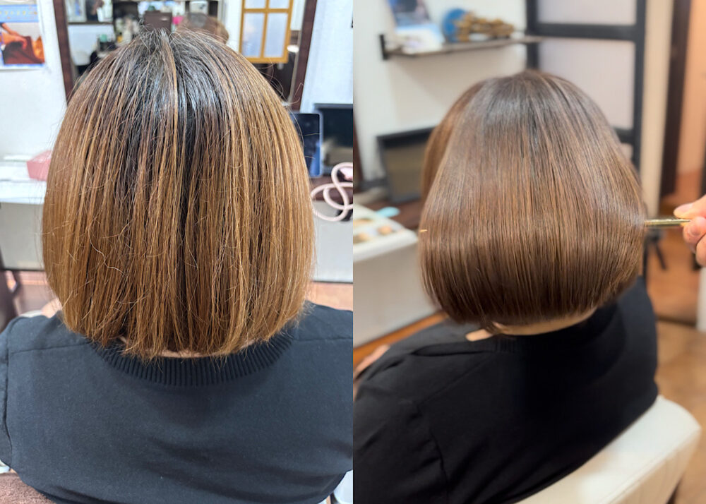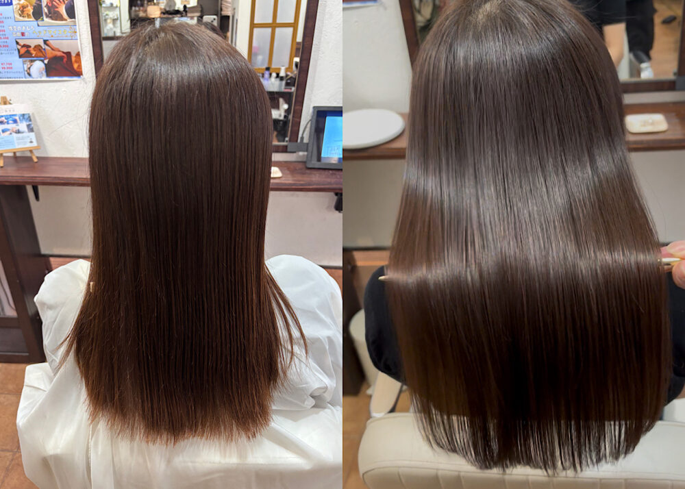 日々の白髪染めや、カラー、ブリーチによるダメージであったり、縮毛矯正のダメージなど、薬剤で傷むことで髪の中の栄養素が出て行ってしまいます。その出て行ってしまった栄養素をすべて補給していき、髪の状態を安定させていくことで質感がよくなり、パサつきを抑えていきます。日々のドライヤー、アイロンによるダメージもありますが、不安な方は是非一度ご相談ください。